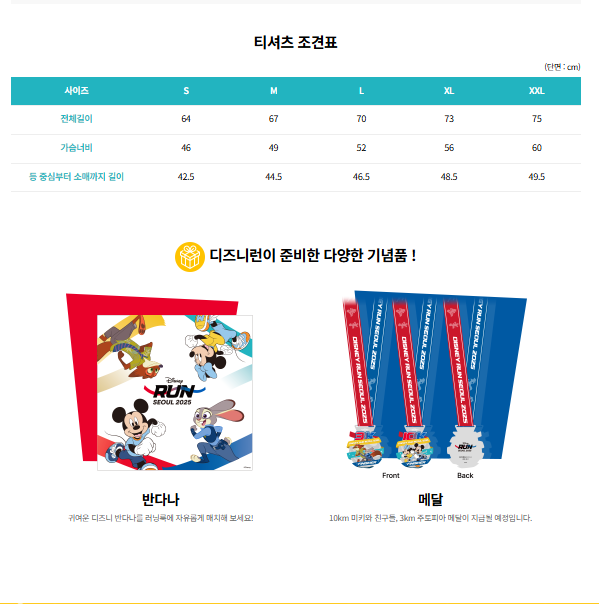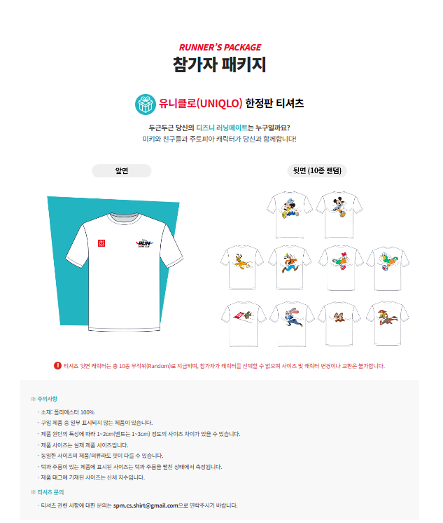 2025 디즈니런 참가자에게는 다양한 굿즈와 혜택이 포함된 패키지가 제공됩니다. 기본적으로 디즈니 캐릭터가 프린팅 된 유니클로 티셔츠, 참가 배번, 완주 메달, 디즈니 기념품 세트 등이 포함되어 있으며, 일부 티켓에는 포토존 이용권, 캐릭터 이벤트 참여 기회도 주어집니다. 굿즈는 행사 전 배송되거나 현장 수령하게 되며, 패키지 수령도 본인 확인이 필요합니다.