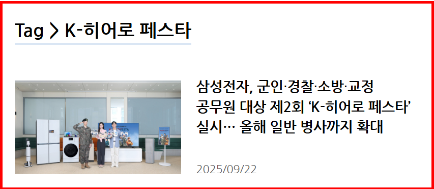 삼성전자는 국가에 헌신하는 분들을 위한 감사 행사 K‑히어로 페스타를 통해 군인·경찰·소방·교정 공무원 대상 할인 혜택을 제공하고 있습니다. 특히 이번 행사에서는 일반 병사까지 할인 대상이 확대되었고, 패밀리몰 기반으로 진행됩니다.