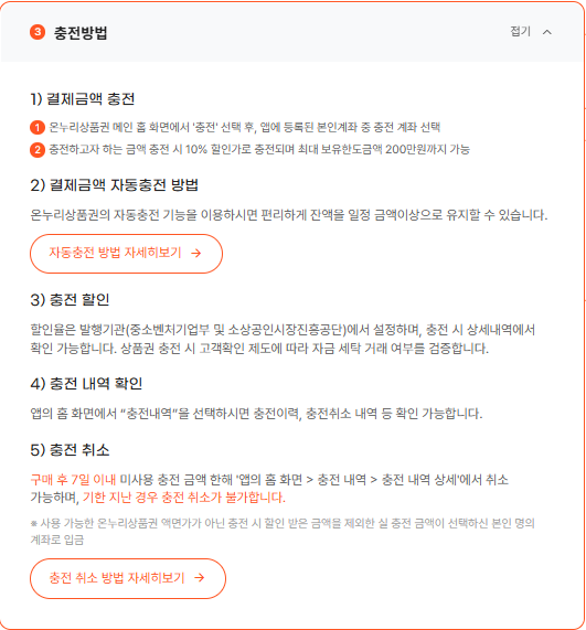 - 충전식 카드형 온누리상품권은 온누리상품권 앱 또는 디지털 온누리 상품권 공식 웹사이트를 통해 충전하여 구매가 가능하며, 본인 인증이 필요합니다. 구매한도 및 할인율이 모바일/전자형이 더 유리한 경우가 많습니다.