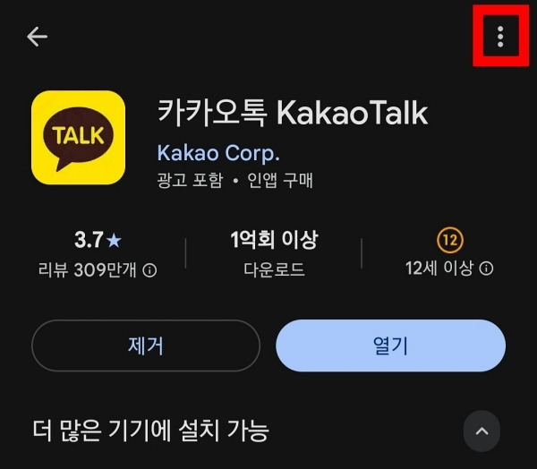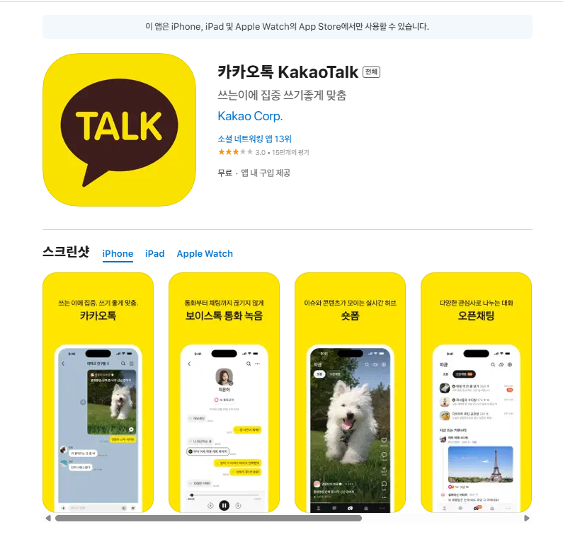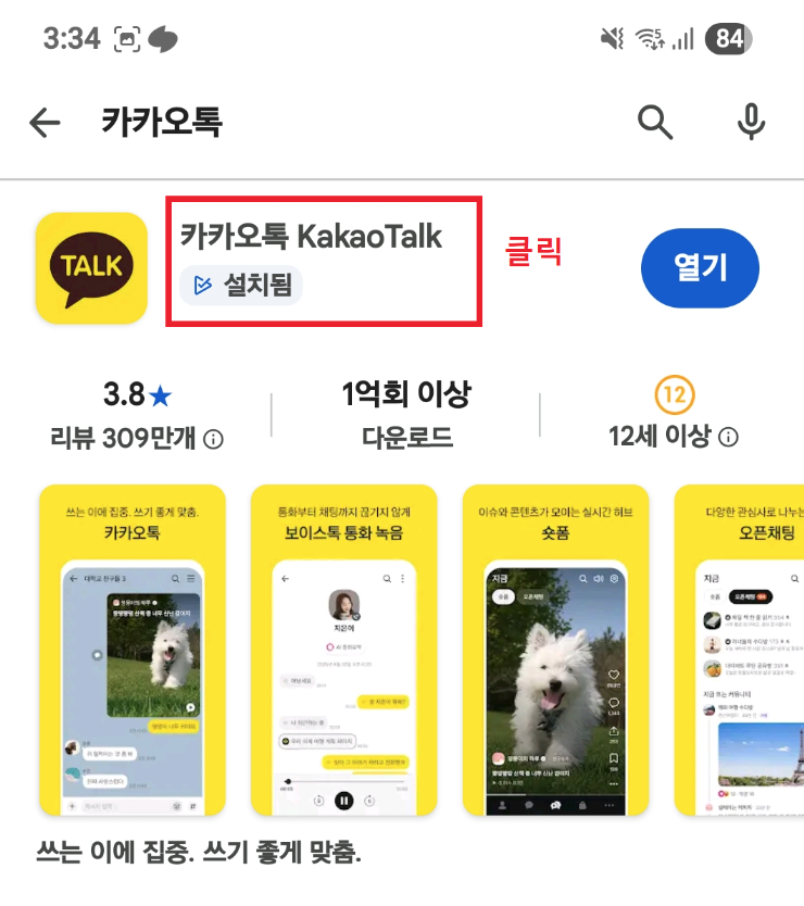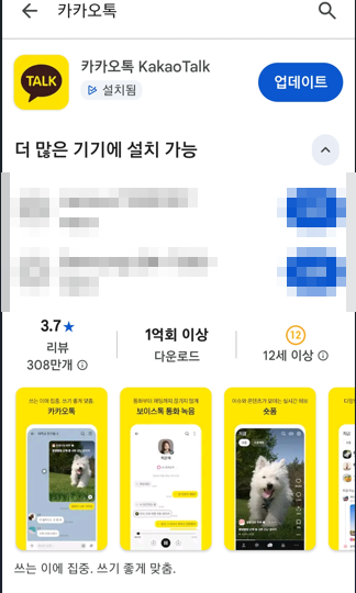 검색창에 “카카오톡” 입력한 뒤 해당 앱 정보 페이지로 이동하세요.