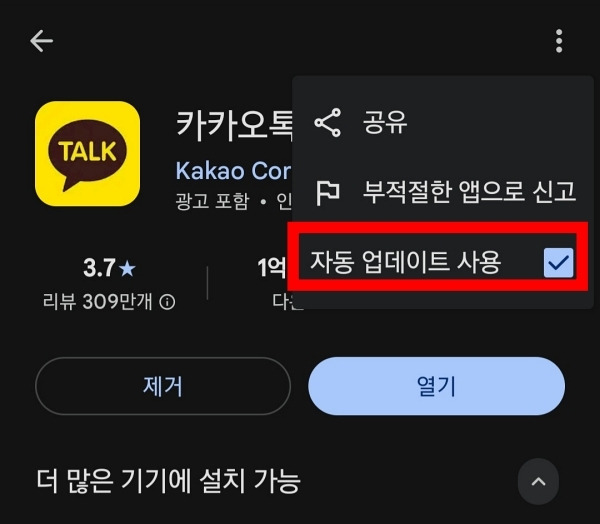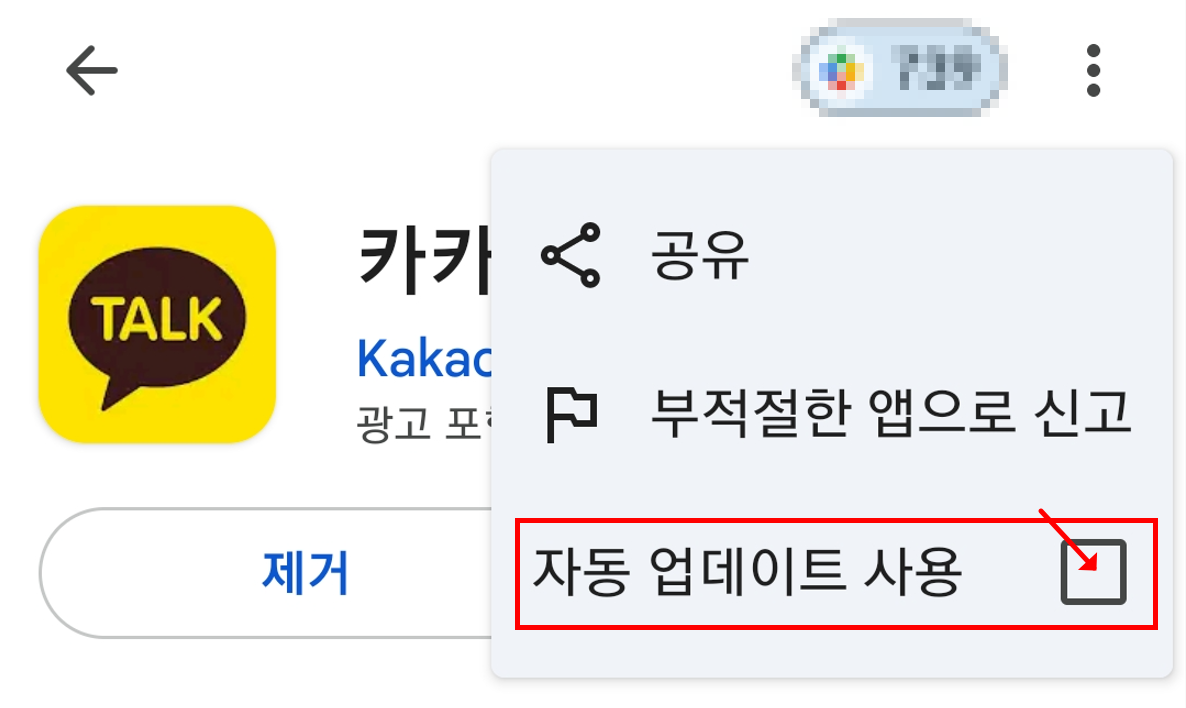 - 카카오톡 앱 정보 페이지에서 “자동 업데이트 사용” 체크박스가 꺼져 있는지 다시 확인하는 것이 안전합니다.